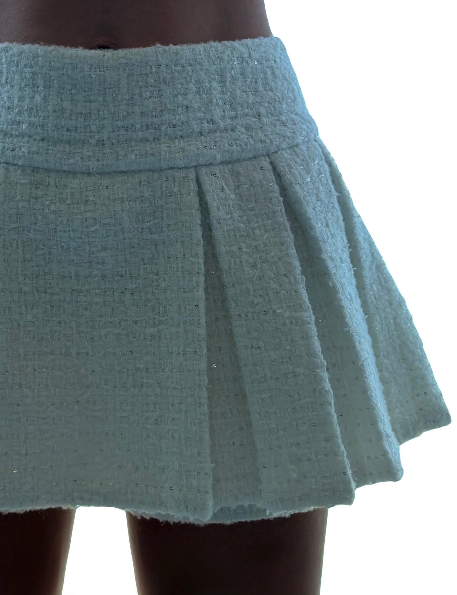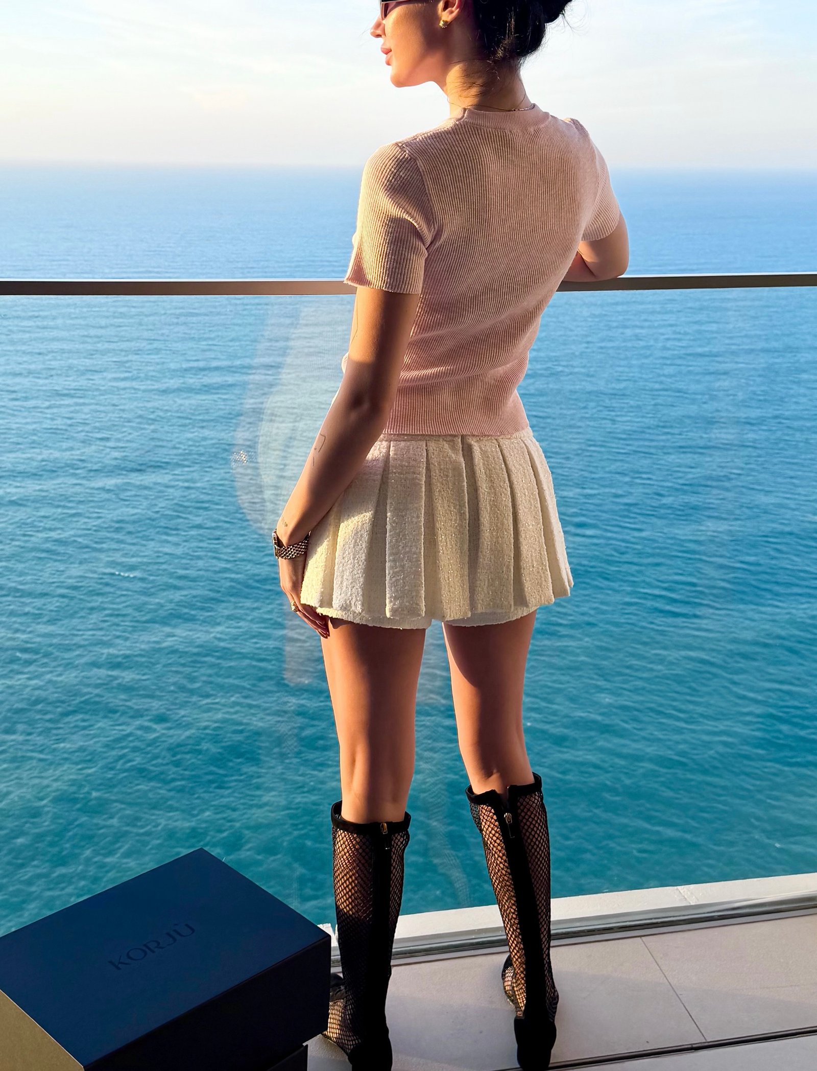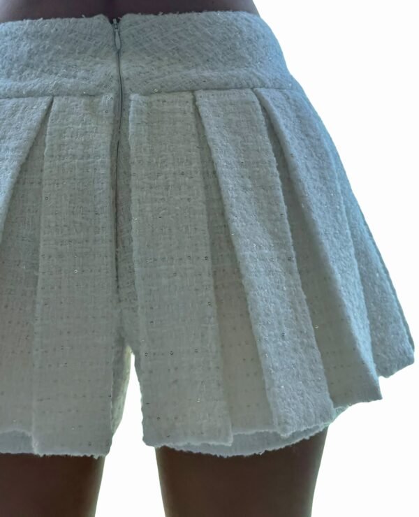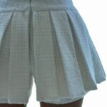 Pleated tweed skort – A structured tweed skort where form meets ease.