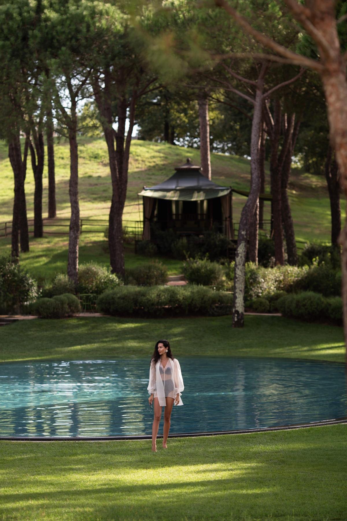 Its flowing silhouette and sheer organza create a presence that feels natural, feminine, and effortlessly refined.