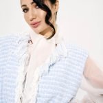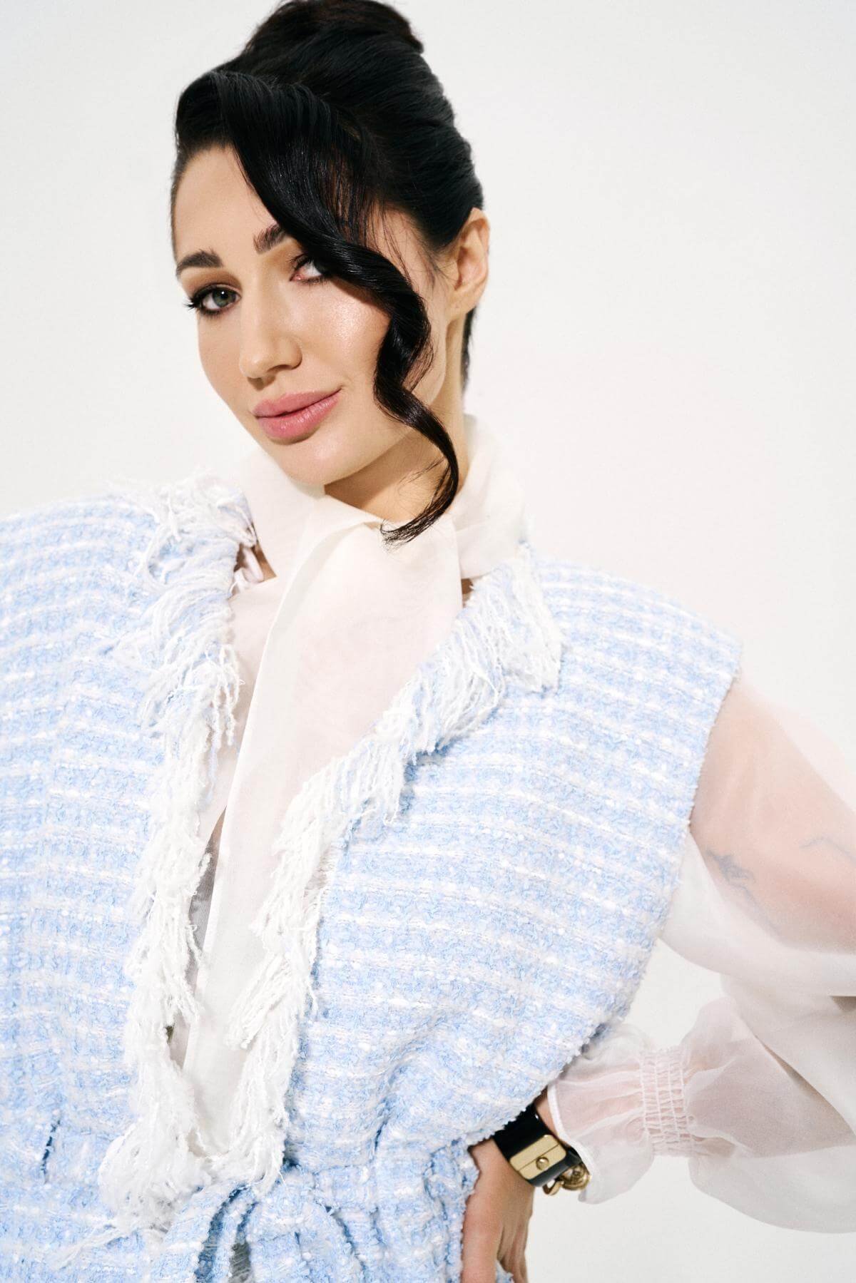 Structured shoulders create a confident frame, while the waist tie refines the line – clean, precise, distinctly feminine.