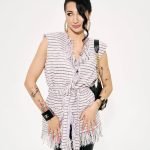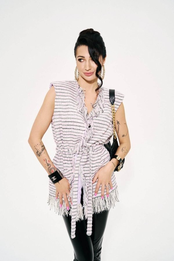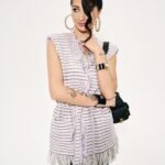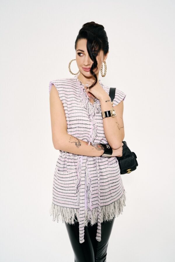 The Outline Vest/Blush Stripe – a study in shape: sharp where it needs to be, soft where it chooses to be. Structured shoulders create a confident frame, while the waist tie refines the line – clean, precise, distinctly feminine.