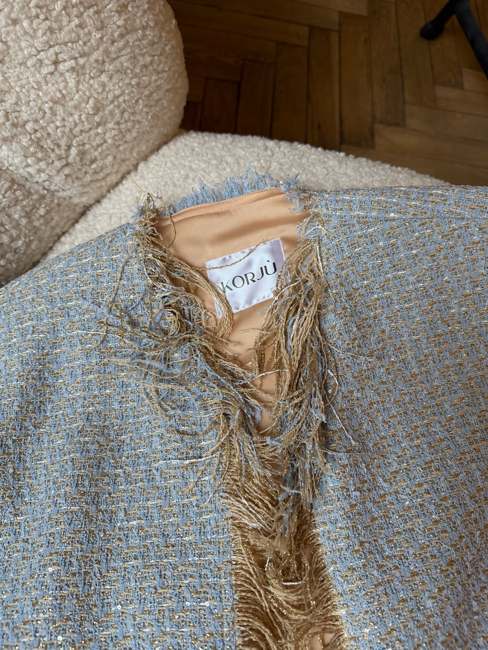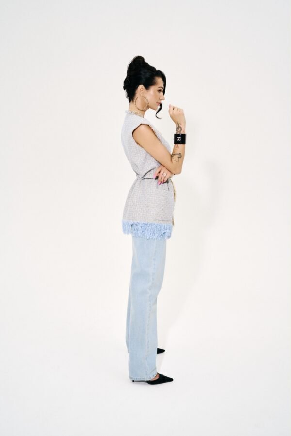Hand-frayed threads introduce a touch of controlled chaos – a human, artisanal detail that adds texture and quiet boldness.