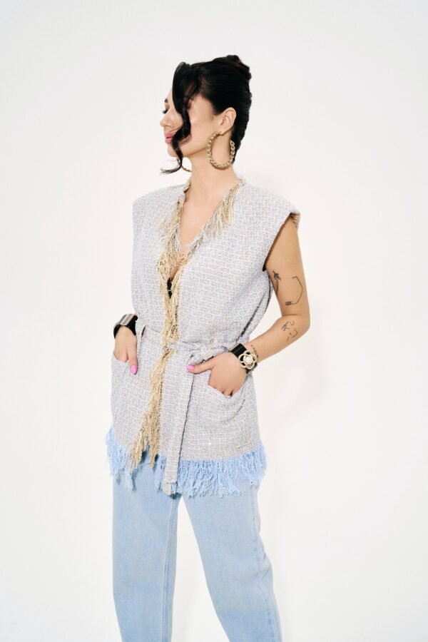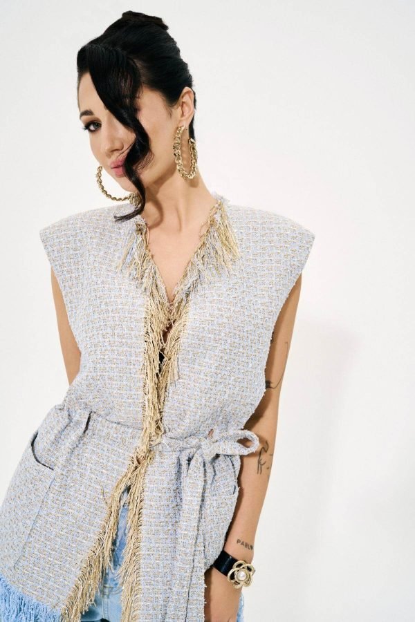 The Outline Vest/Golden Mist – a study in shape: sharp where it needs to be, soft where it chooses to be.